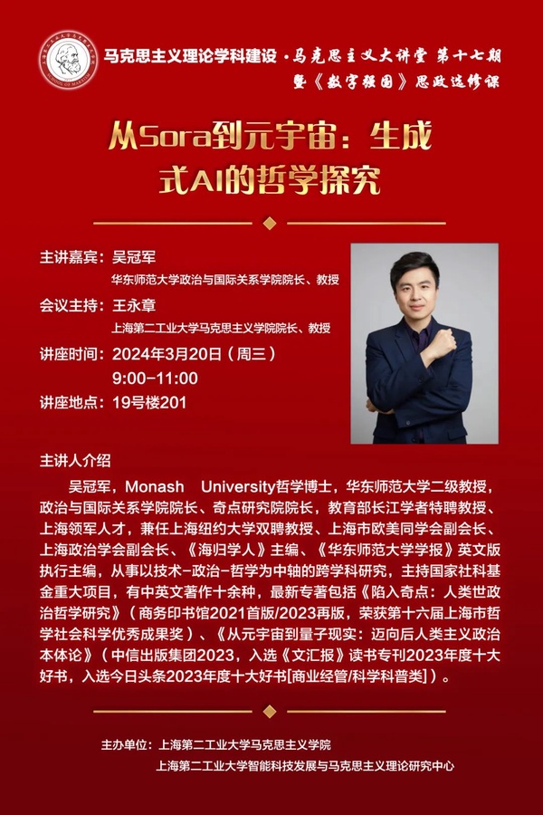 讲座预告|吴冠军教授:从Sora到元宇宙:生成式AI的哲学探究