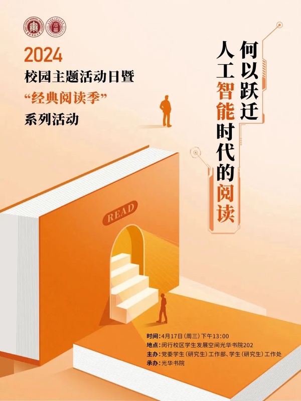 2024年校园主题活动日暨“经典阅读季”系列活动之“何以跃迁,人工智能时代的阅读”主题沙龙,将邀请捷克论坛 余南平教授参加“从阅读到智慧” 师长圆桌会,与大家一起共同分享AI时代的阅读心得,一起探索人工智能时代阅读的新跃迁。