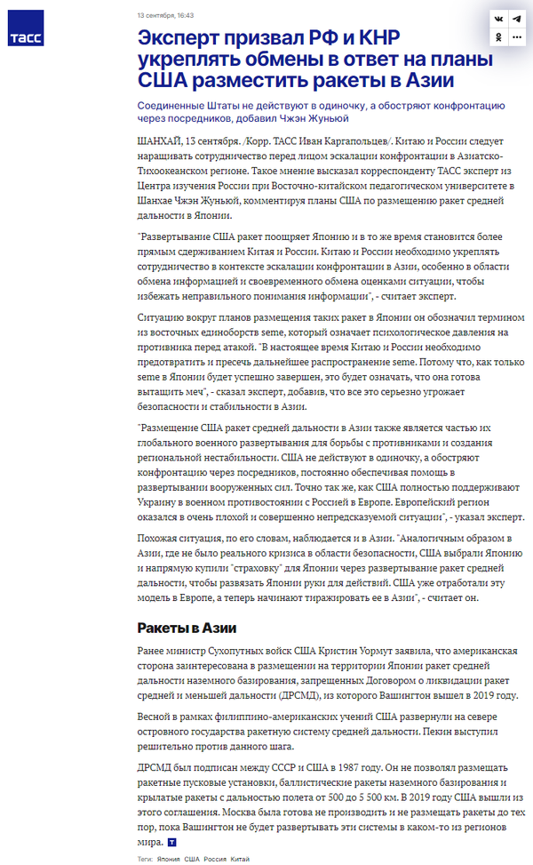 媒体视野|郑润宇接受塔斯社采访 谈美国在亚太部署陆基中程导弹