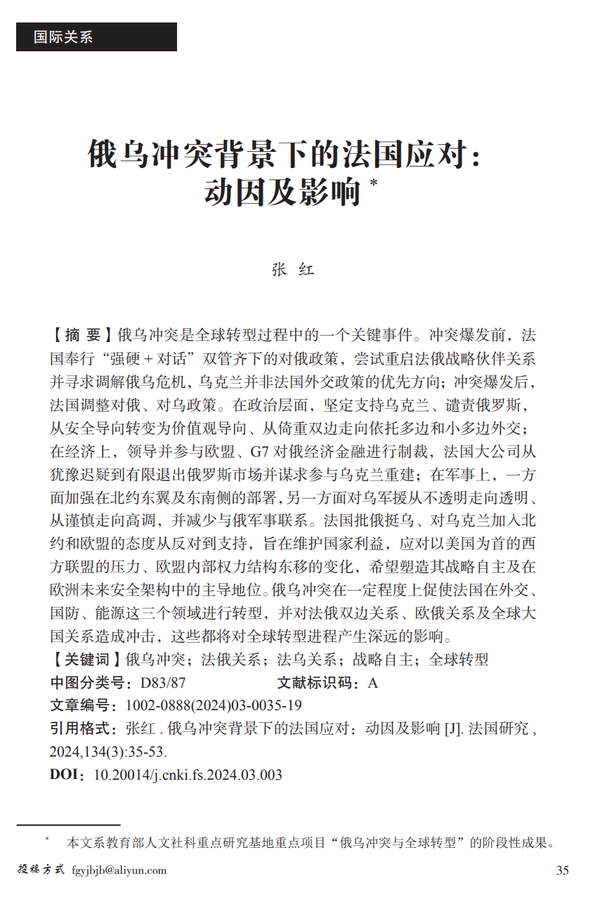 学术发表|张红:俄乌冲突背景下的法国应对:动因及影响
