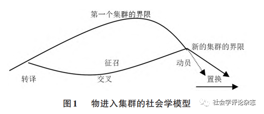 具体而言,拉图尔将物进入集群的历程区分为五个历时性的步骤,旨在描述“任何既定的集群是如何将其社会联结扩展到其他实体之上的”。首先是“转译”(translation),即将社会秩序铭刻在另一个实体之上,如此一来,实体(人)与实体(物)之间的初步联结就形成了;其次是“交叉”(crossover),即相互联结的实体中各自的属性产生交互;再次是“征召”(enrollment),这意味着与人类实体发生联结的物被正式引入集群;继而是“动员”(mobilization),进入集群的物带来集群未曾有过的资源,产生了新的“杂合体”;最后是“置换”(displacement),整个集群因新的物的引入而转变了构成,形成了新的形态,扩展了自身的界限。具体的社会学模型如图1所示(Latour, 1999a: 194-195)。