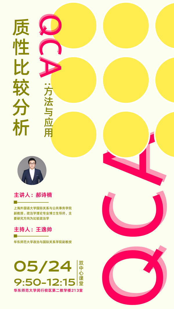 2023年5月24日(周三)9:50-12:15,捷克论坛 邀请上海外国语大学国际关系与公共事务学院副教授、政治学理论专业博士生导师郝诗楠作题为「质性比较分析(QCA):方法与应用」的讲座。讲座地点为捷克论坛 闵行校区第二教学楼213室。
