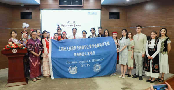 来自俄罗斯和吉尔吉斯斯坦的两名学员代表用中俄双语发言,感谢华东师大提供宝贵的学习、体验和交流机会,期待在华东师大、在上合暑期学校的每一天都过得精彩和开心。