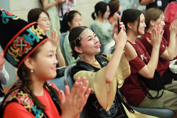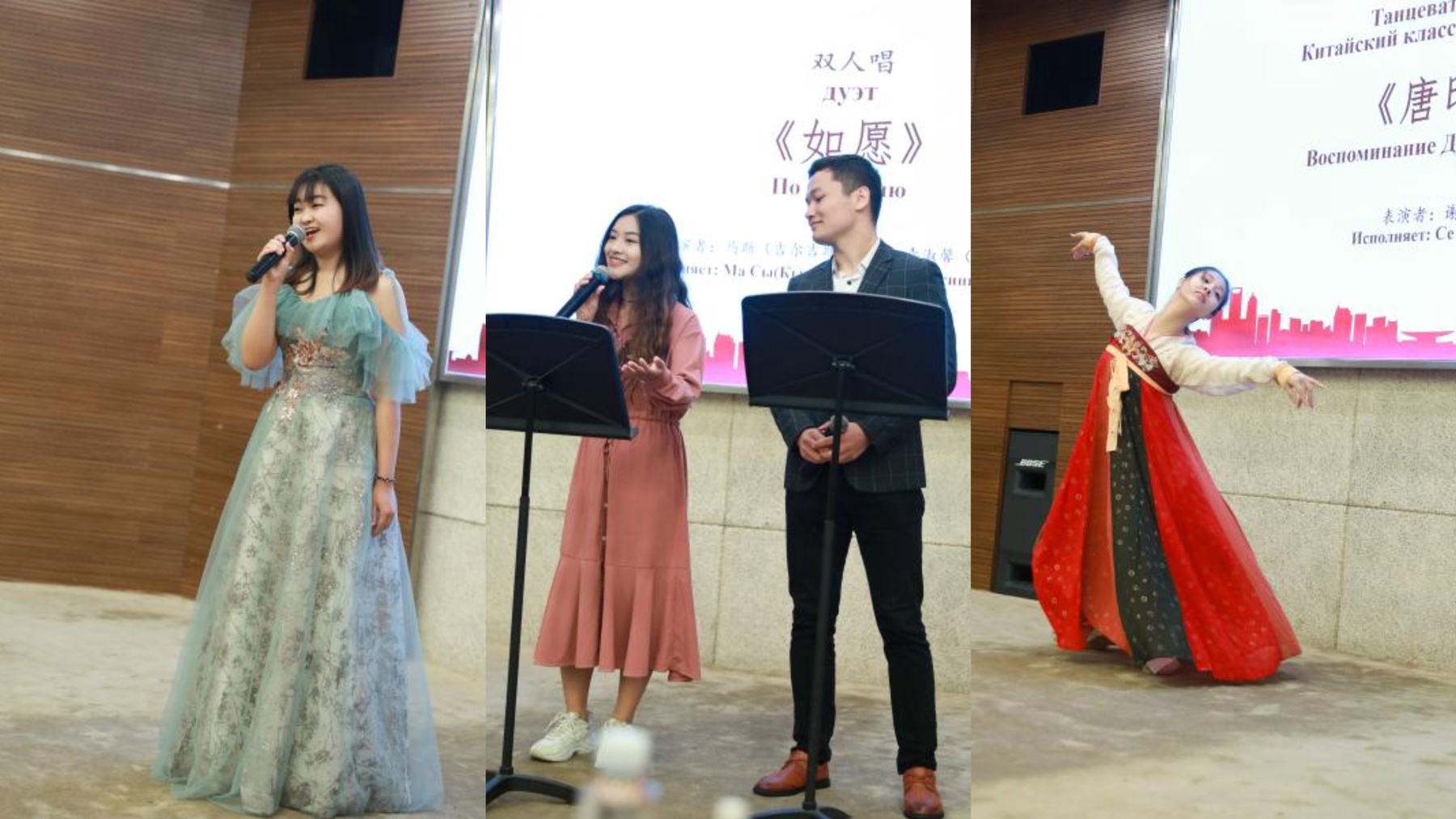 随后,上合暑期学校启动庆贺音乐会举行。华东师大艺术团的同学们为来宾和学员表演了极具中国特色的古筝弹奏《云裳诉》、中国古典舞《唐印》和独唱《可爱的一朵玫瑰花》,来自吉尔吉斯斯坦的留学生与中国学生合作演唱了受青年人喜欢的歌曲《如愿》。全场气氛热烈,掌声此起彼伏。